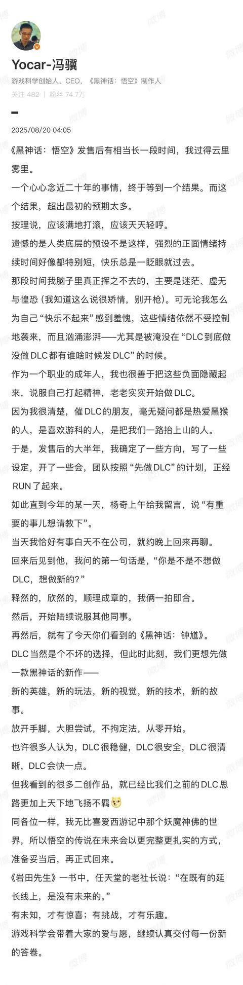 游戏科学创始人、CEO,《黑神话:悟空》制作人冯骥,在凌晨发布长文,解释了为何选择制作一款新作。其微博原文如下: