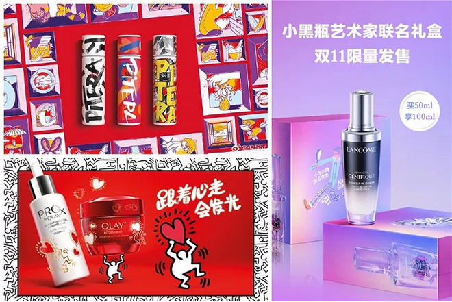 以2020年为例,兰蔻集结了不同领域艺术家,从服装、珠宝、插画、动画等多个角度出发,设计推出了双11艺术家联名礼盒。OLAY联手街头艺术家Keith Haring,以“追心”涂鸦艺术作品为灵感,推出“追心联名款”。SK-II也携手国际知名设计师,将神仙水的核心成分Pitera以涂鸦的风格呈现在瓶身上。丸美则携手东方顶级艺术家村上隆,推出衍生款丸美小红笔眼霜和丸美小弹簧眼霜……