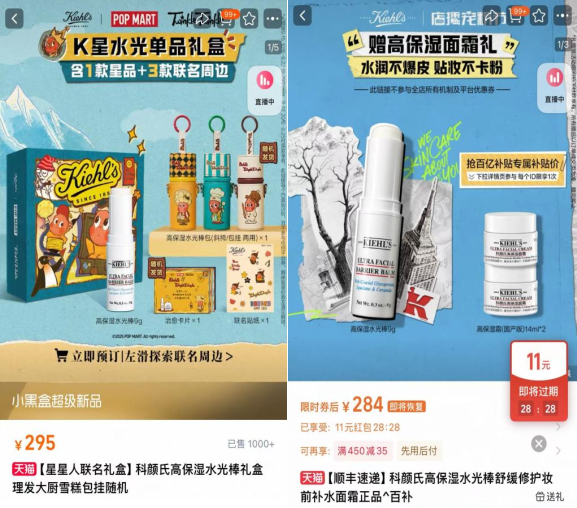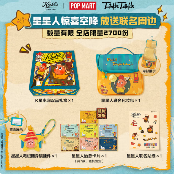 9月8日,科颜氏Kiehl's通过官方公众号宣布,联合泡泡玛特旗下热门IP“星星人”推出限量款“K星水润双品礼盒”。该联名礼盒已于当晚在天猫、京东、抖音及线下渠道同步开启预售。 该礼盒内含2款科颜氏明星产品及4款专属联名周边,定价为645元。