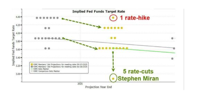 然而,真正的“意外”藏在细节之中。最新的“点阵图”显示,在19名FOMC成员中,有12名预计今年至少还会再降息一次(其中9名预计两次,2名预计一次,1名甚至预计五次),这比他们在6月份的预测多了一次,释放了比预期更强的鸽派信号。