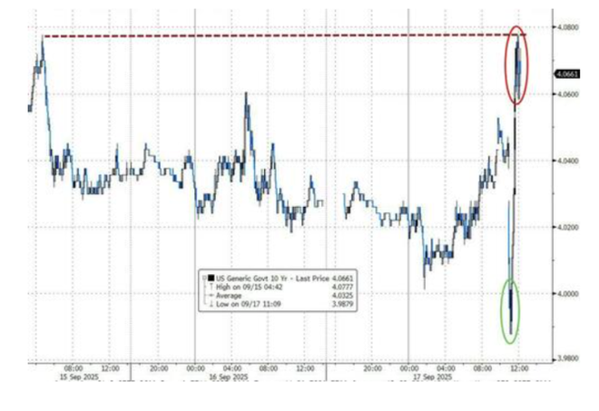 但随着鲍威尔开始讲话,市场风向迅速逆转。美债收益率飙升,10年期国债收益率在短暂跌破4.00%后迅速反弹至日内高点。