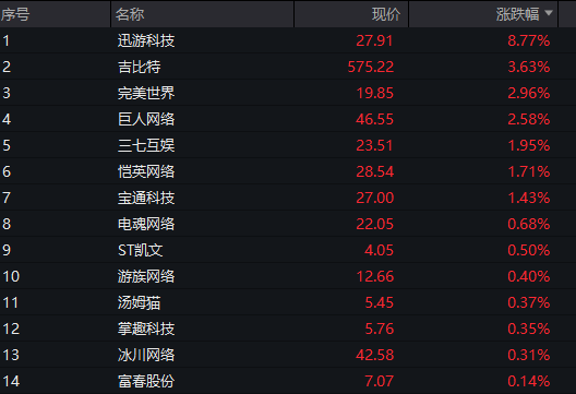 A股游戏板块盘初拉升,迅游科技涨超10%,巨人网络、吉比特涨超3%,完美世界、三七互娱跟涨。