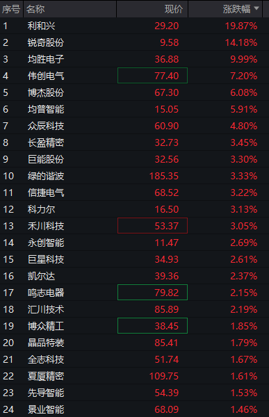 机器人概念股延续强势,均胜电子、景兴纸业双双3连板,东睦股份、利和兴、伟创电气股价创新高,科森科技、万向钱潮等跟涨。