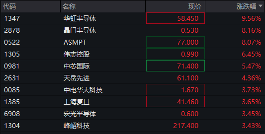 港股芯片股走强,华虹半导体涨超10%,ASMP涨超8%,中芯国际涨超5%。