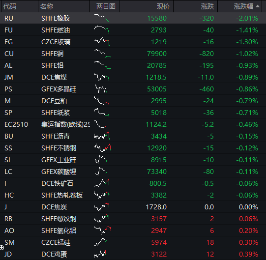 商品:国内商品期货多数走低,截至发稿,橡胶跌超2%,燃油、玻璃、铜跌超1%,铝、焦煤、多晶硅、豆粕、纸浆、集运指数、沥青、不锈钢、工业硅、碳酸锂、铁矿石、热卷板等下跌,仅有螺纹钢、氧化铝、锰硅、鸡蛋等少数品种上涨。![]()