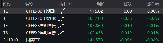 债市:国债期货全线下跌,截至发稿,30年期主力合约持平,10年期主力合约跌0.03%,5年期主力合约跌0.01%,2年期主力合约跌0.01%。![]()