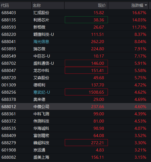 科创50指数扩大涨幅至2%,站上1400点,再创3年多新高,科创芯片股领涨,权重股海光信息涨超7%,寒武纪涨近5%重返1500元上方,龙芯中科、中微公司、盛美上海等涨幅靠前。