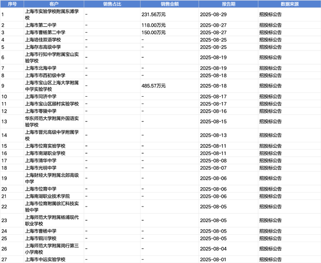 截至9月18日发稿时,天眼查显示,今年8月,绿捷共有27次中标,包括华东师范大学附属外国语实验学校、上海市光明中学、上海市位育中学、上海市清华中学、上海市宝山区行知外国语学校等。