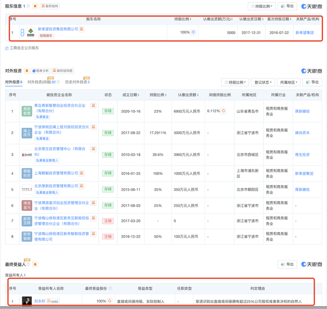 天眼查数据显示,北京厚生投资管理中心(有限合伙)的合伙人包括拉萨经济技术开发区新地实业有限公司,后者出资39.6%,为新希望投资集团有限公司的全资子公司。