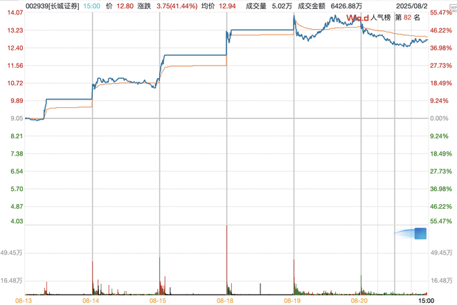 8月13日、14日、15日、18日,长城证券连续4个交易日涨停,累计涨幅达46.63%。