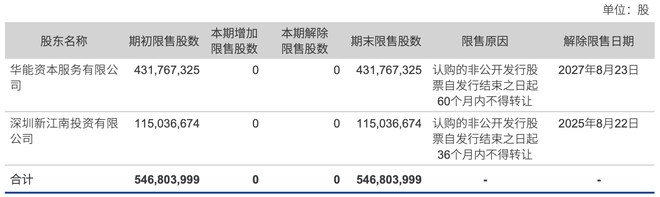 根据长城证券2024年年报,除新江南投资所持股份解禁外,公司控股股东华能资本所持4.32亿股的解禁日期为2027年8月23日。