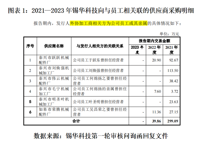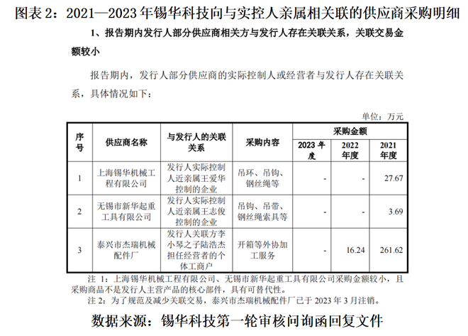 第一轮审核问询函回复文件显示,2021—2023年,除了在开箱、打磨、涂装等生产环节向6家由锡华科技员工或员工亲属经营的外协加工厂商采购加工服务,以及向实控人王荣正的胞妹王爱华、胞弟王志俊名下的企业采购吊环、吊钩、钢丝绳等,锡华科技亦向实控人陆燕云之兄长陆庆东儿子陆浩杰经营的泰兴市杰瑞机械配件厂采购开箱、打磨等外协加工服务。