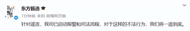 东方甄选则发布声明:针对谣言,我司已启动报警和司法流程,对于这样的不法行为,我们将一追到底。
