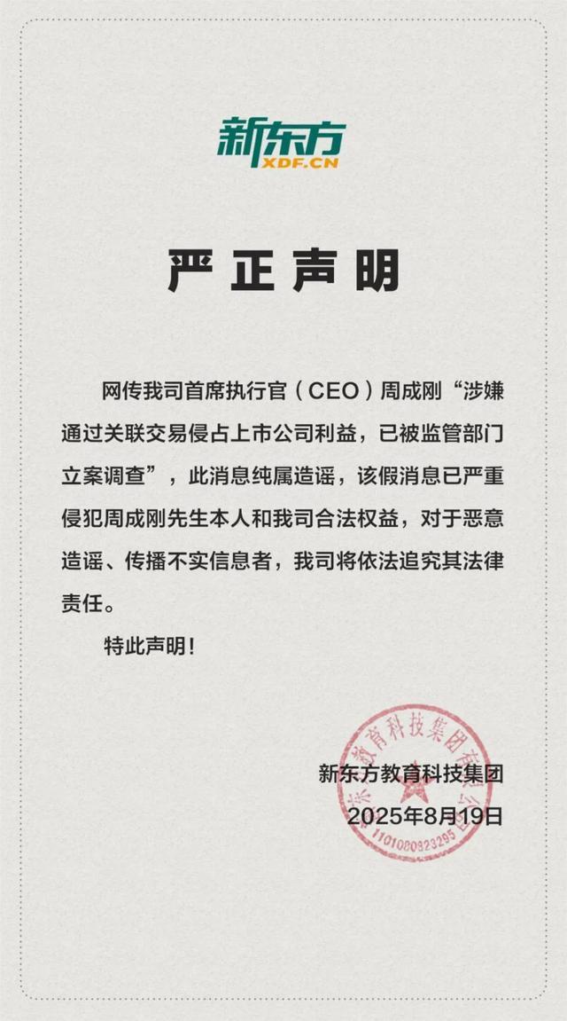 新东方也发布严正声明:网传我司首席执行官(CEO)周成刚“涉嫌通过关联交易侵占上市公司利益,已被监管部门立案调查”,此消息纯属造谣,该假消息已严重侵犯周成刚先生本人和我司合法权益,对于恶意造谣、传播不实信息者,我司将依法追究其法律责任。