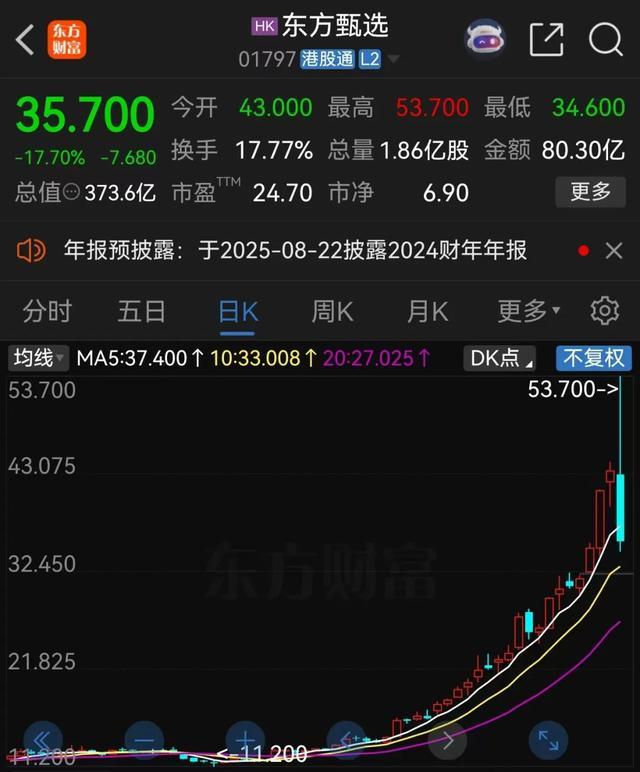 今日东方甄选股价上演“天地板”,早盘一度暴涨逾23%,午后高台跳水,盘后跌20.89%。