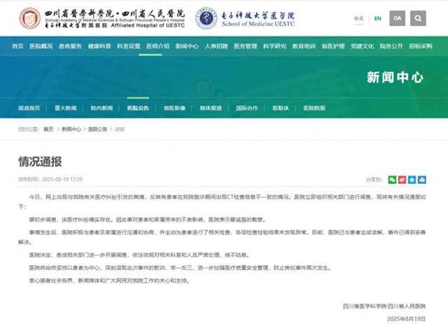今日,网上出现与我院有关医疗纠纷引发的舆情,反映有患者在我院就诊期间出现CT检查信息不一致的情况。医院立即组织相关部门进行调查,现将有关情况通报如下: