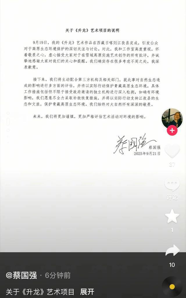 同日,蔡国强在短视频平台发布说明,对此事“深表歉意”: