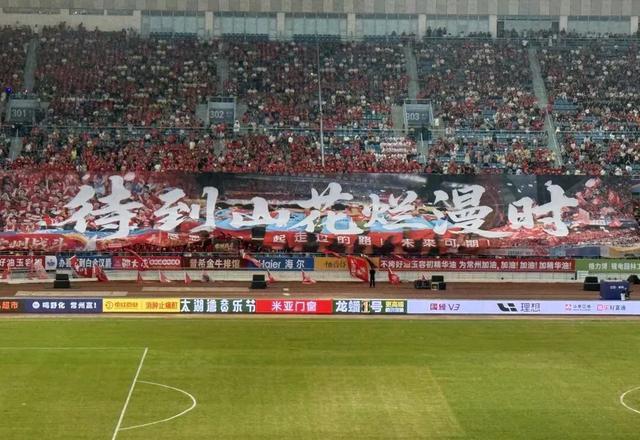9月13日,球迷助威团方阵在今年苏超常州队最后一个主场,展开巨幅Tifo。(图源:常州发布)