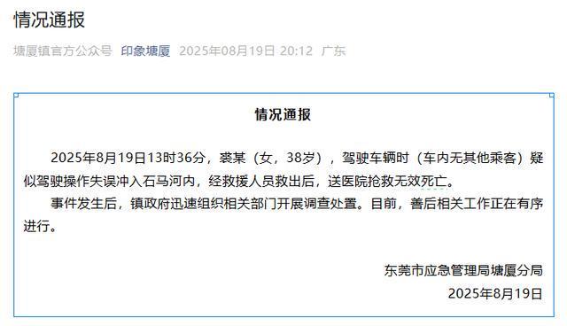 东莞通报:裘某(女,38岁),驾车冲入河内身亡