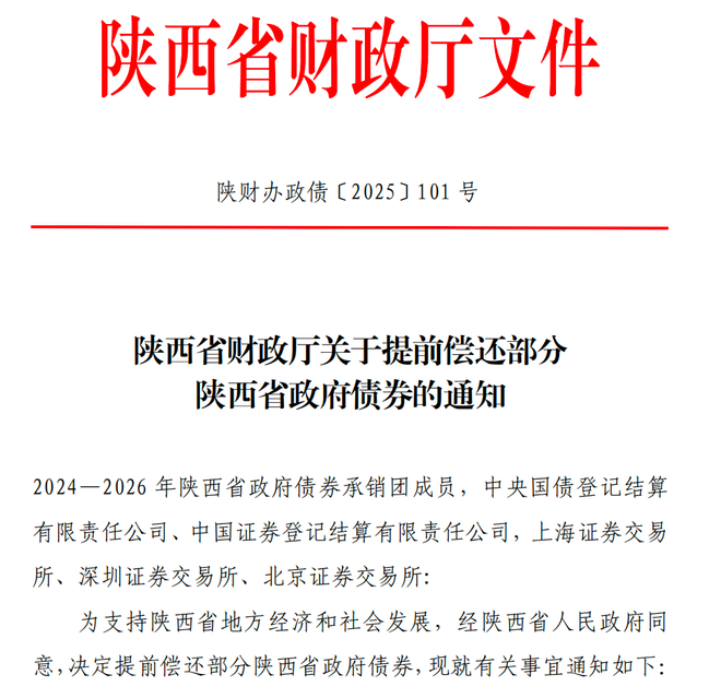 9月9日,陕西省财政厅官网发布公告,将提前偿还部分省政府债券,提前偿还的债券包括两只专项债。