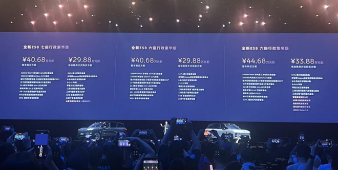 新车共有六座行政豪华版、六座行政签名版和七座行政豪华版三个版本。其中,六座行政豪华版整车购买价格为40.68万元起,采用电池租用服务(BaaS)后为29.88万元起。