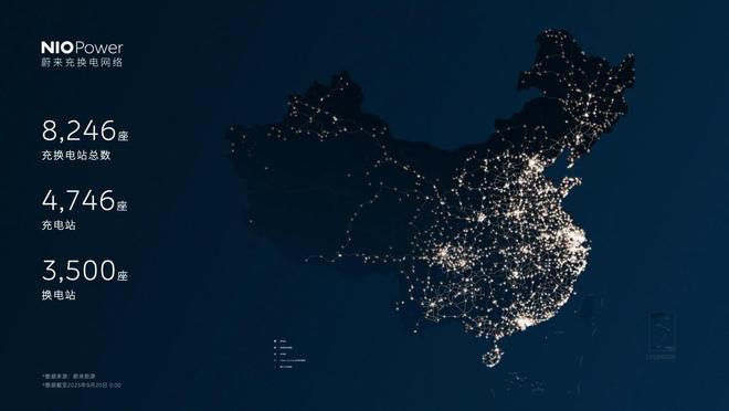 NIODay2025现场公布的数据显示,截至9月20日零点,蔚来已在全国范围内累计建设8246座充换电站,其中换电站3500座、充电站4746座;已建成覆盖全国的9纵11横16大城市群高速换电网络,超过1000座高速公路换电站,连通全国550座城市。