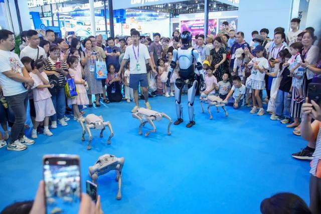 走进展馆,如果看到一群人围成一个圆圈,那多半是机器狗又来“遛弯”了,它能跑能翻跟斗,还会主动凑上前举起双手“求握手”。