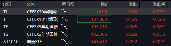 债市:国债期货全线走高,截至发稿,30年期主力合约涨0.07%,10年期主力合约涨0.12%,5年期主力合约涨0.08%,2年期主力合约涨0.03%。![]()
