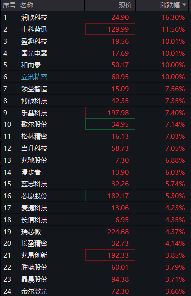 消费电子概念全线爆发,立讯精密、和而泰、盈趣科技、国光电器相继封板,润欣科技涨超14%,领益智造、歌尔股份涨逾5%。