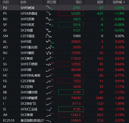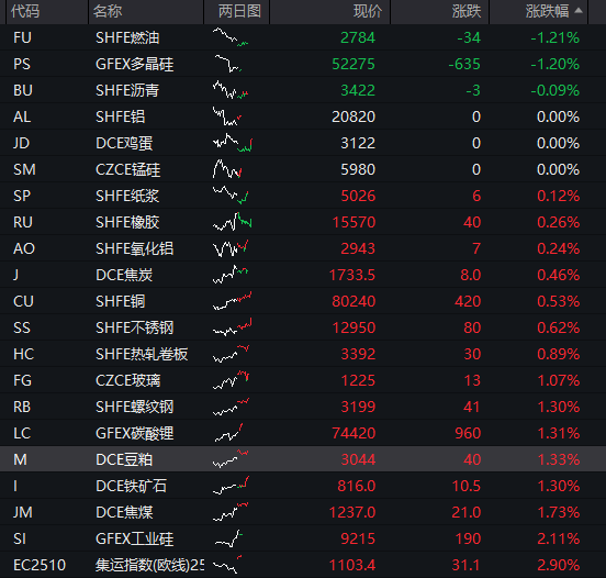 商品:国内商品期货普涨,截至发稿,集运指数、工业硅涨超2%,铁矿石、焦煤、豆粕、碳酸锂、螺纹钢、玻璃等涨超1%,热卷板、不锈钢、铜、焦炭、氧化铝、橡胶等走高。燃油、多晶硅、沥青等跌超1%。![]()