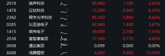 港股苹果概念股同样打仗,鸿腾精密涨13.92%、高伟电子涨7.77%、丘钛科技涨6.78%、蓝思科技涨6.03%。