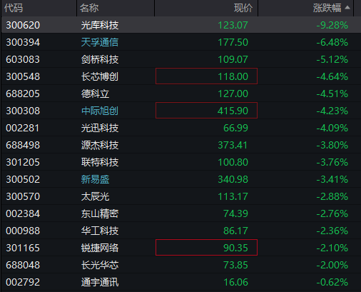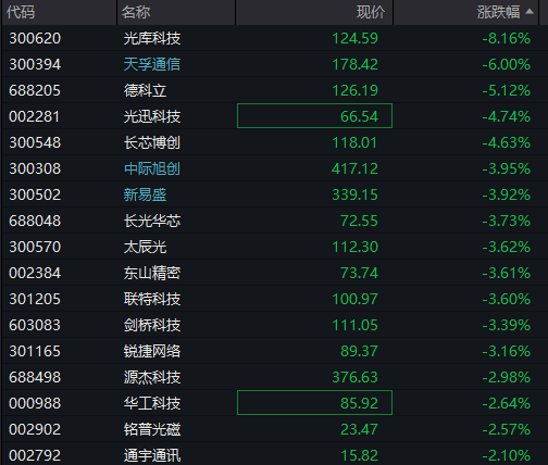 AI硬件股集体调整,CPO、覆铜板、电路板等纷纷下跌,天孚通信跌超6%,中际旭创、光迅科技、新易盛等跌幅居前。