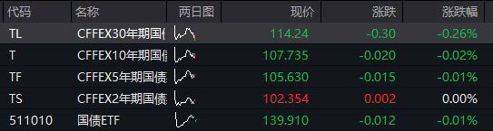 债市:国债期货全线下跌,截至发稿,30年期主力合约跌0.26%,10年期主力合约跌0.02%,5年期主力合约跌0.01%,2年期主力合约持平。![]()