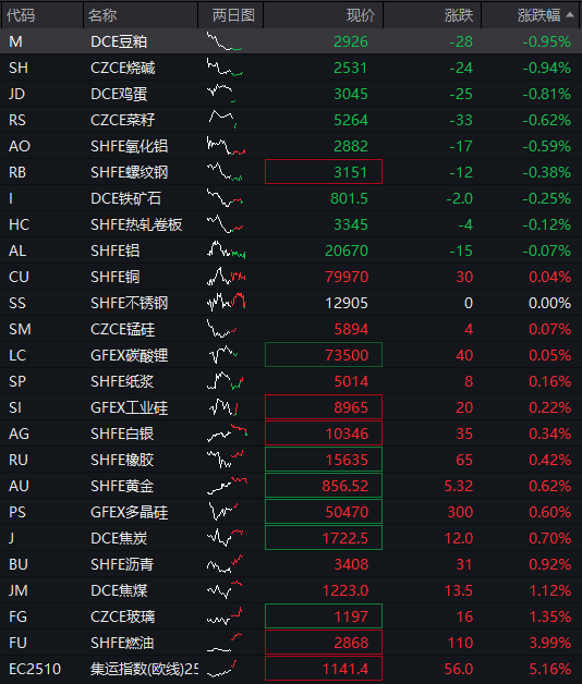 商品:国内商品期货多数上涨,截至发稿,集运指数涨超5%,燃油涨4%,玻璃、焦煤涨超1%,沥青、焦炭、多晶硅、黄金、橡胶等走高。热卷板、铁矿石、螺纹钢等下跌,烧碱、豆粕跌近1%。![]()