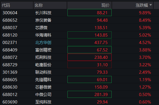 半导体设备股反复活跃,长川科技、盛美上海涨超10%,京仪装备、北方华创涨超3%,均创历史新高,芯源微、华海清科、耐科装备等跟涨。