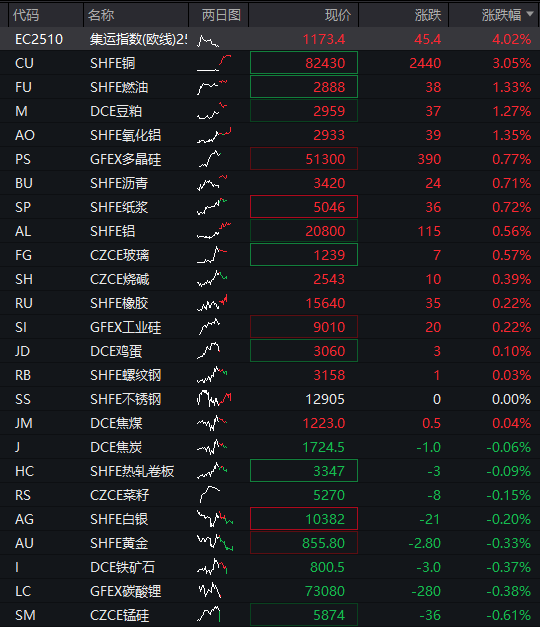 商品:国内商品期货多数上涨,截至发稿,沪铜、集运指数涨超2%,玻璃、豆粕、燃油、多晶硅等涨超1%,沥青、氧化铝、纸浆、烧碱、铝、鸡蛋、橡胶等小幅走高。工业硅、焦炭、热卷板、菜籽、沪银、铁矿石、沪金等下跌。![]()