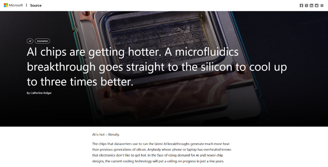 微软将冷却液集成到芯片用于提高性能和降低功耗。