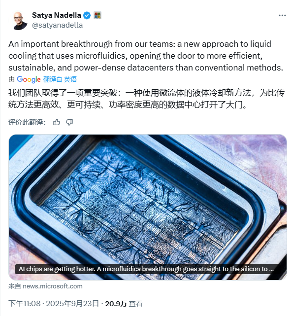 当地时间9月23日,微软CEO Satya Nadella在X上宣布:“们正在重新想象芯片的冷却方式,让未来的 AI 基础设施更高效、更可持续。”