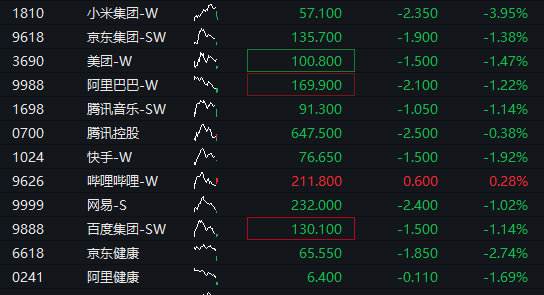港股科网股普遍下跌,小米跌近4%,京东健康跌超2%,京东集团、美团、阿里等跌超1%。