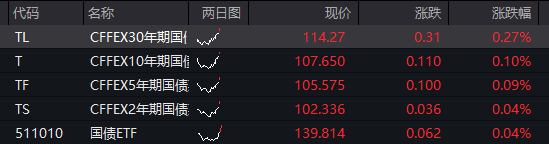 债市:国债期货全线反弹,截至发稿,30年期主力合约涨0.27%,10年期主力合约涨0.10%,5年期主力合约涨0.09%,2年期主力合约涨0.04%。![]()