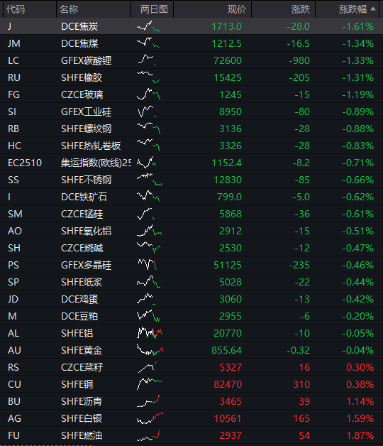 商品:国内商品期货普跌,截至发稿,焦炭、焦煤、碳酸锂、橡胶、玻璃等跌超1%,工业硅、螺纹钢、热卷板、集运指数、不锈钢、铁矿石、锰硅、氧化铝、烧碱、多晶硅、纸浆、鸡蛋、豆粕等纷纷下跌。![]()