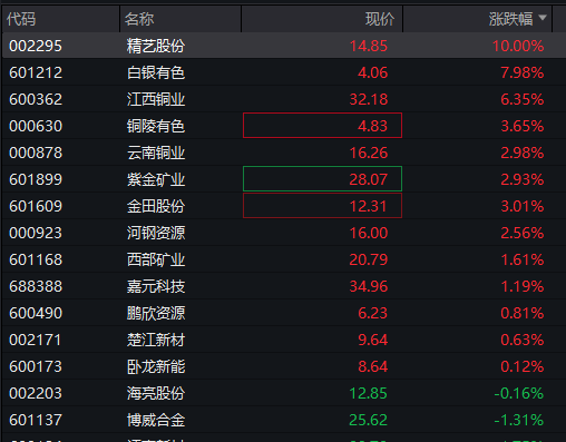 有色板块再度拉升,金属铜方向领涨,精艺股份、丽岛新材涨停,江西铜业、铜陵有色、豫光金铅、白银有色等跟涨。