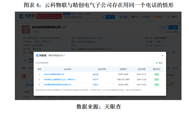 天眼查则显示,云科物联最新联系电话为0516-66235230,而精创物联最新联系电话为0516-80300069,与精创电气招股书所披露投资者联系电话相同,而徐州美控最新联系电话为15312631718。