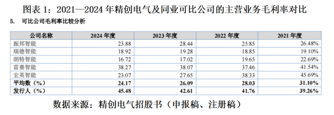 招股书还显示,2021—2024年,在多家同行业可比上市公司毛利率下滑的情形下,精创电气的毛利率却逐年稳步提升。