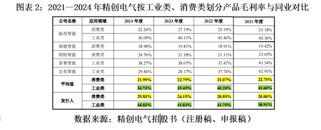 招股书还显示,按消费类、工业类分类的产品毛利率对比,精创电气消费类、工业类产品毛利率在2021年均低于同期同业均值,在2024年却明显高于同期同业均值,且分别高出7.84个、9.29个百分点。