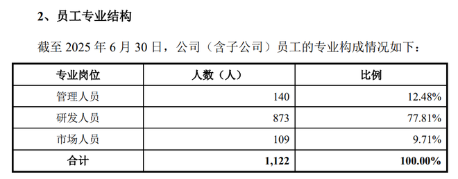 截至2025年6月30日,摩尔线程有员工共1122人,其中,研发人员占了大头,达到77.81%(873人)。
