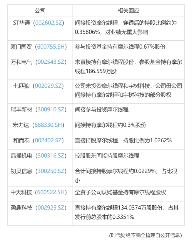 据时代财经不完全统计,在投资者互动平台和公告中,有ST华通(002602.SZ)、厦门国贸(600755.SH)、万和电气(002543.SZ)、七匹狼(002029.SZ)、瑞丰新材(300910.SZ)、宏力达(688330.SH)、和而泰(002402.SZ)、晶盛机电(300316.SZ)、初灵信息(300250.SZ)、中天科技(600522.SH)、盈趣科技(002925.SZ)等不下两位数的上市公司在近期“闪现”,官宣公司与摩尔线程的关联。