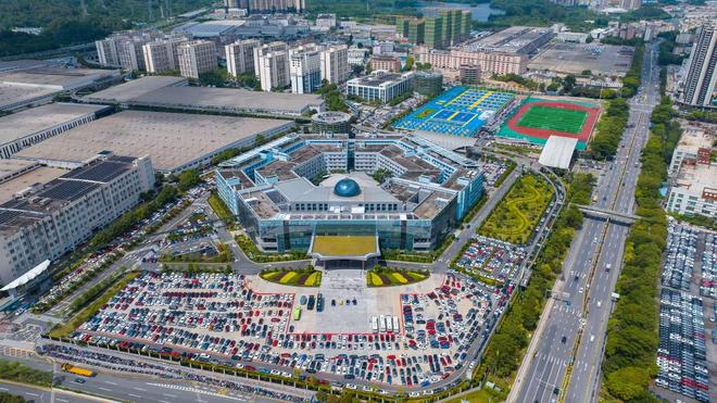 从走出坪山高铁站开始,比亚迪云巴在空中穿梭而过,可以直达比亚迪六角大楼,数层停车场里停满了比亚迪汽车。在六角大楼旁,有一条被命名为“比亚迪路”的道路。坪山基地的研究院、实验室、工厂、数以万计的员工如毛细血管般支撑起这个全球新能源龙头,周边的比亚迪自建小区、学校、幼儿园又为这个庞然大物的持续运转输送养分。