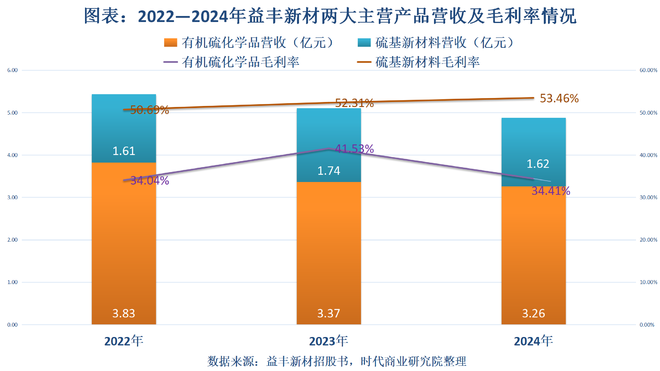 从毛利率来看,报告期各期,益丰新材有机硫化学品的毛利率分别为34.04%、41.53%、34.41%,而硫基新材料的毛利率分别为50.69%、52.31%、53.46%,远高于有机硫化学品。