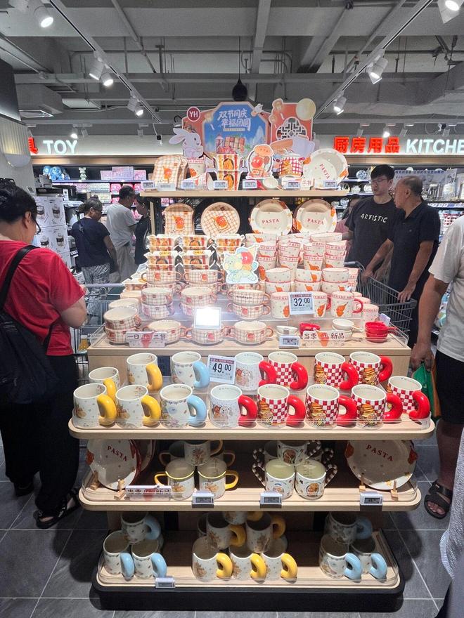 在年轻化方面,借助名创优品在潮玩方面优势,丽影广场店此次也引进了毛绒玩具、星星人系列以及蜡笔小新系列餐具、史努比保温杯等多个网红IP产品。